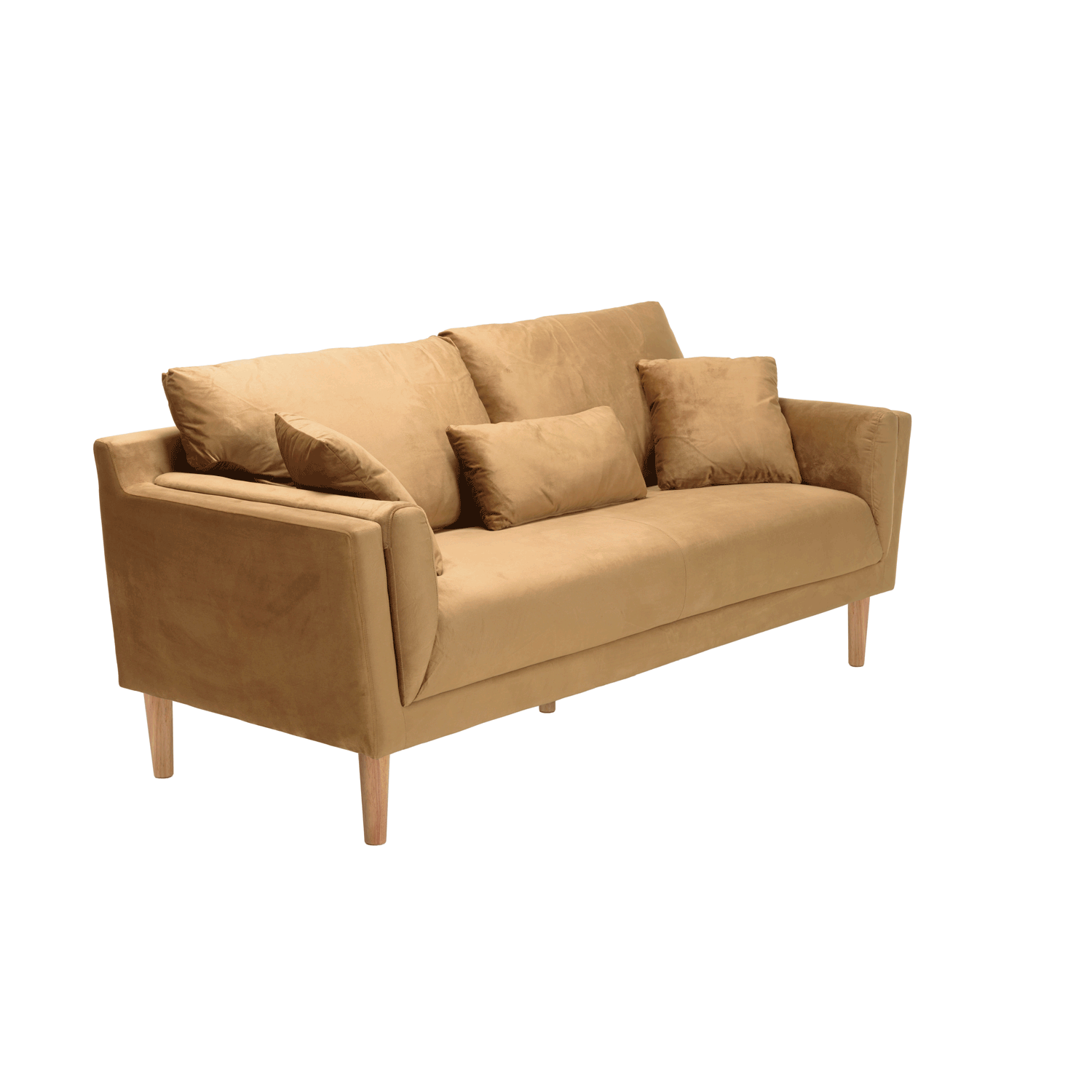 Canapé PARIS 3 places tissu couleur camel pieds bois. Dimensions : 199 x 85 x 91 cm. Article en velours et métal.