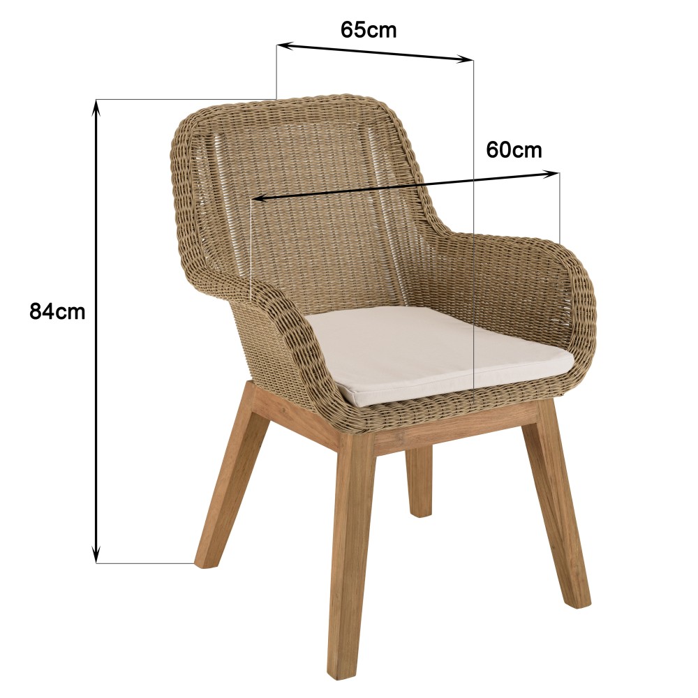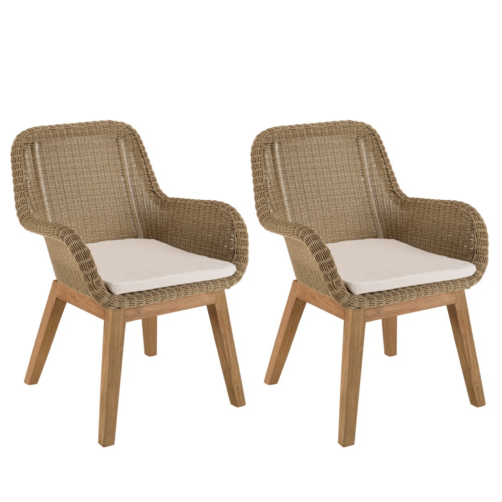 Lot de 2 fauteuils jardin rotin synthétique et coussin, pieds droits. Article en rotin synthétique/Teck/Mousse/Aluminium/Tissu polyester 100%. Dimension 60 x 65 x 84 cm