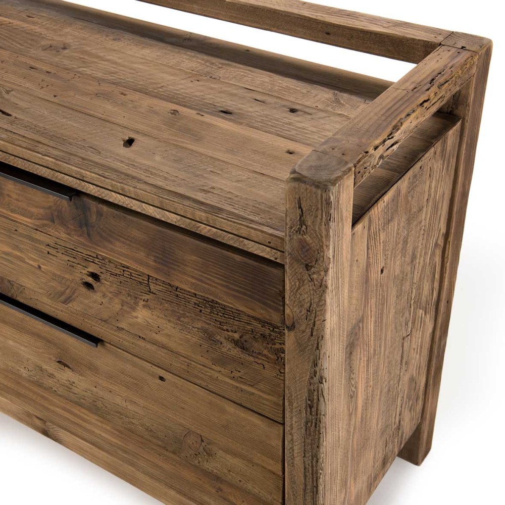 Ce beau meuble en pin recyclé, très minimaliste, donnera du caractère à votre salon. Son côté massif rappelle l’hiver et les vacances à la montagne qui vous détendra au quotidien. Ses petites poignées noires susciteront un air chic qui vous séduiront au premier regard.