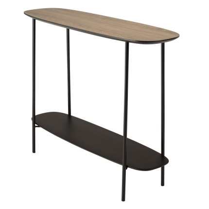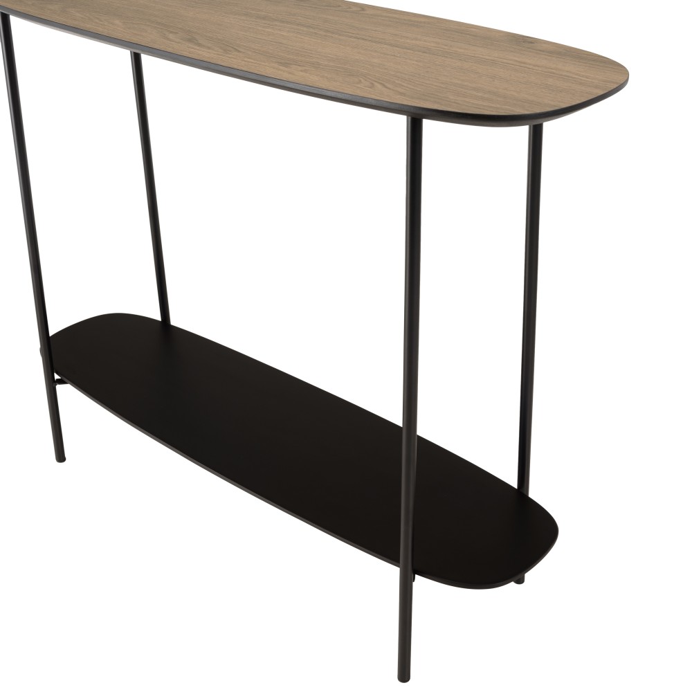 Console 2 plateaux 100x30cm bi-matière mocha/noir pieds métal. Article en MDF plaqué papier texturé/MDF/Acier. Dimension 100 x 30 x 75 cm.