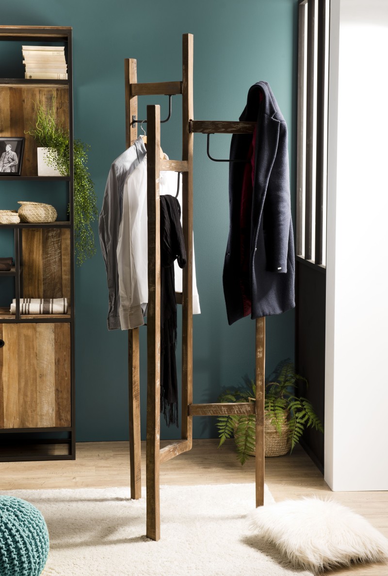 Brown 3-leaf coat rack made from recycled teak and metal. Dimensions: 57 x 50 x 199 cm. Made from recycled teak.