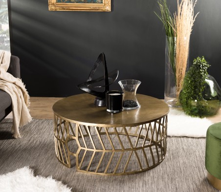 Round coffee table 89x89cm, gold aluminum, graphic base. Dimensions: 89 x 89 x 38 cm. Made of aluminum.