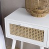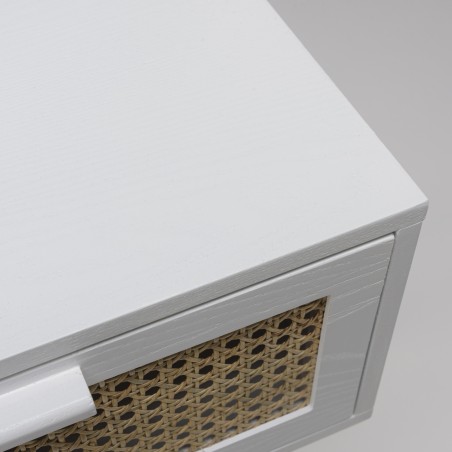 White bedside table with 1 natural wicker drawer. Dimensions: 40 x 30 x 55 cm. Article in ash/rattan veneered MDF.