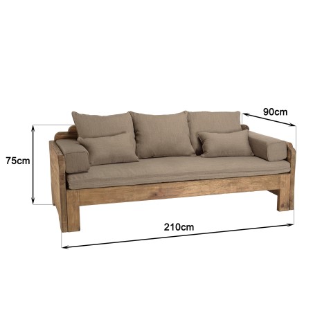 3-seater recycled pine wood sofa bed with cushions. Dimensions: 210 x 90 x 75 cm. Item in recycled pine/polyester fabric.