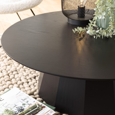 Black round coffee table 90x90cm. Dimensions: 90 x 90 x 32.5 cm. Article in oak veneered MDF.