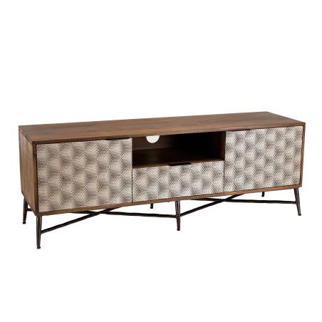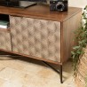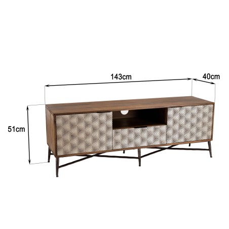Mango wood TV cabinet with 2 doors and 1 drawer, ethnic patterns. Dimensions: 143 x 40 x 51 cm. Article in Mango wood/Steel/MDF.