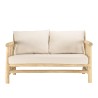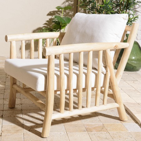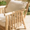 BORNEO set: 2-seater sofa, 2 armchairs, and 1 teak coffee table. Items made of teak/polyester fabric. Dimensions: Sofa: 131 x 82 x 80 cm / Armchair: 70 x 82 x 80 cm / Coffee table: 120 x 65 x 46 cm