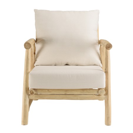 MADURA set: 2-seater sofa, 2 armchairs, and 1 teak coffee table. Made of teak/polyester fabric. Sofa dimensions: 132 x 88 x 88 cm / Armchair: 72 x 88 x 90 cm / Armchair: 72 x 88 x 90 cm / Table: 120 x 63 x 46 cm.