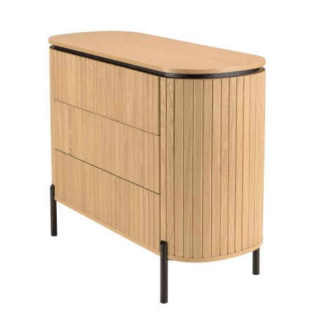 Brown chest of drawers with 3 retro-style drawers. Pine with black metal legs. Made of melamine/pine/steel. Dimensions: 100 x 42.5 x 78 cm.