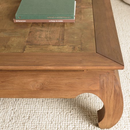 Elegance and originality meet in our recycled teak opium table, a must-have piece revisited here with a mosaic top. With its dimensions of 120x120 cm, this unique piece will bring a touch of character to your interior.