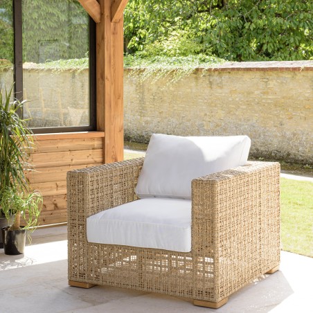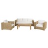 6-seater garden furniture set in beige openwork synthetic rattan. Made of synthetic rattan/steel/teak/olefin/polyurethane foam/polyester fiber. Sofa dimensions: 242 x 100 x 71 cm/armchair: 102 x 100 x 71 cm/armchair: 102 x 100 x 71 cm/coffee table: 140 x 70 x 41 cm