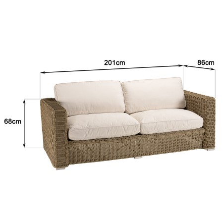 5-seater garden furniture set in taupe synthetic rattan. Item made of synthetic rattan/aluminum/frayed foam, dacron, silicone. Sofa dimensions: 201 x 86 x 68 cm / armchairs: 90 x 86 x 68 cm / table: 141 x 76 x 42.5 cm.