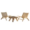 Bring a touch of elegance to your outdoor space with this garden furniture set, consisting of a round coffee table made from recycled teak and two armchairs.