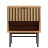 Bring a fresh new look to your bedroom with this bedside table featuring a natural wood effect and black grooves.
