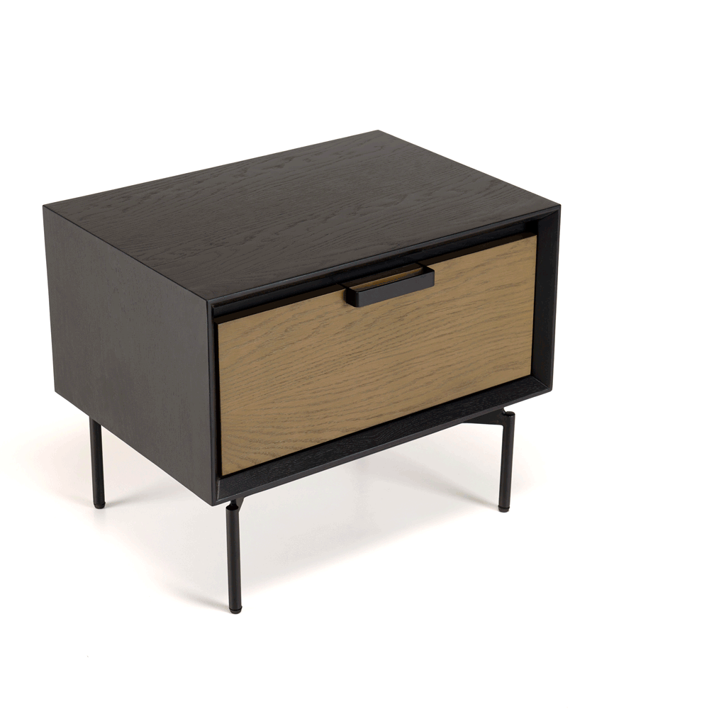 Table de chevet noire 1 tiroir marron foncé pieds métal noir. Dimensions : 55 x 40 x 45.5 cm. Article en MDF plaqué chêne/Acier/MDF.