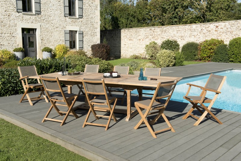 SALON DE JARDIN EN BOIS 10/12 pers. Dimensions : 200/300 x 120 x 75 cm. Articles en teck brut et textilène.