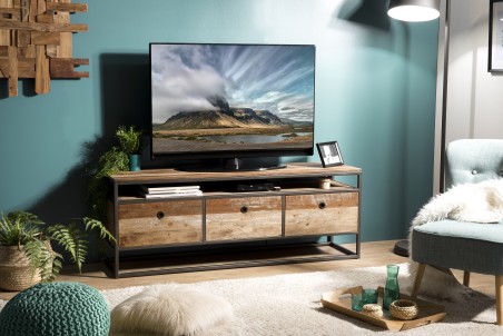 Meuble TV marron 3 tiroirs Teck recyclé Acacia Mahogany recyclé et métal noir. Dimensions : 150 x 40 x 55 cm. Article en Teck recyclé et Acacia, Mahogany recyclé.