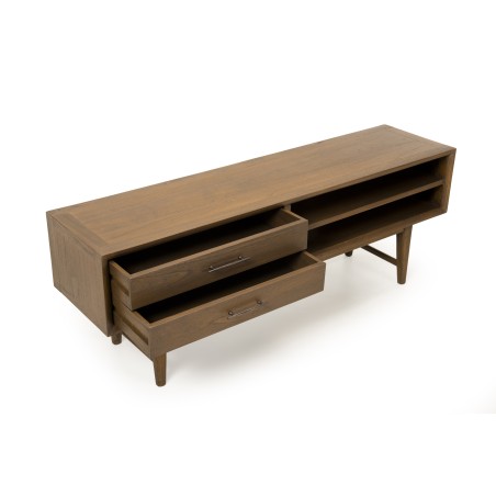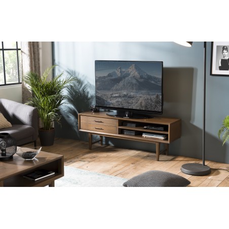 Meuble TV marron 2 tiroirs 2 niches bois Mindi. Dimensions : 140 x 35 x 50 cm. Article en Mindi et Contreplaqué de Mindi.