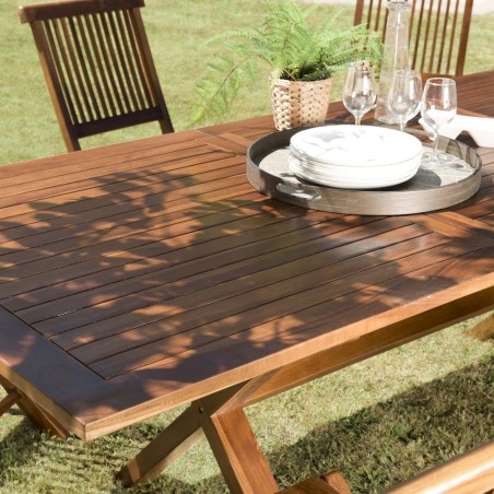Salon de jardin en bois huilé 8/10 personnes. Dimensions : 1 table rectangulaire : 180/240 x 100 x 75 cm ; Chaises java : 45 x 60 x 90 cm. Articles en teck huilé.