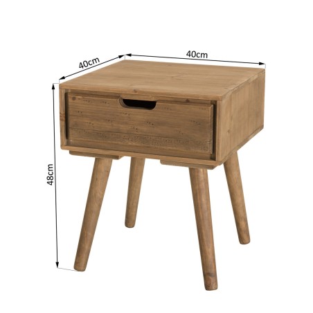 Chevet scandinave bois marron 1 tiroir Sapin. Dimensions : 40 x 40 x 48 cm. Article en Sapin et fonds de tiroirs et arrière caisse en contreplaqué.