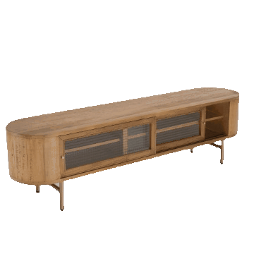 Meuble TV arrondi couleur naturelle bois peuplier 2 portes coulissantes en verre. Dimensions : 180 x 40 x 50 cm. Article en Peuplier/Acier/Verre/Contre plaqué (arrière).