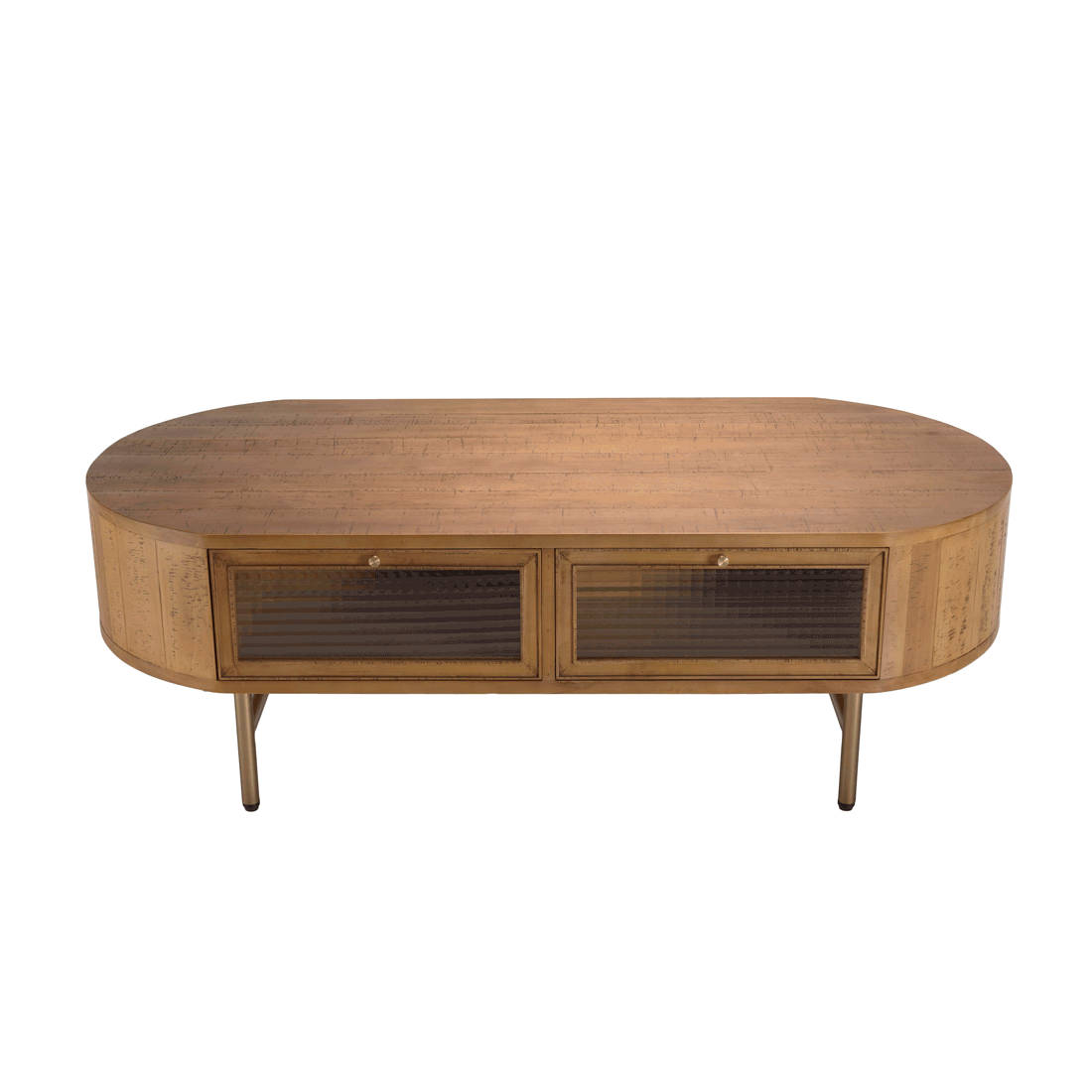 Table basse ovale couleur naturelle bois Peuplier 4 tiroirs vitrés. Dimensions : 140 x 70 x 44 cm. Article en Peuplier/Acier/Verre/Contre plaqué (arrière).