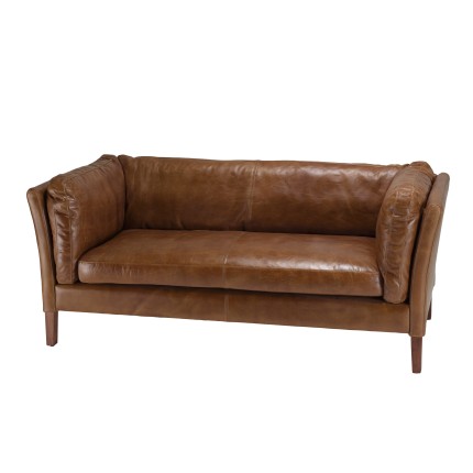 Canapé marron MILANO vintage cuir 3 places pieds bois. Dimensions : 182 x 84 x 79 cm. Article en Cuir de vache / Plumes / Mousse / Chêne / Contreplaqué.