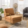 Fauteuil lounge tissu orange métal doré accoudoirs bois. Dimensions : 62 x 75 x 74 cm. Article en Tissu chenillé / Mousse / Acier / Chêne / Contreplaqué.