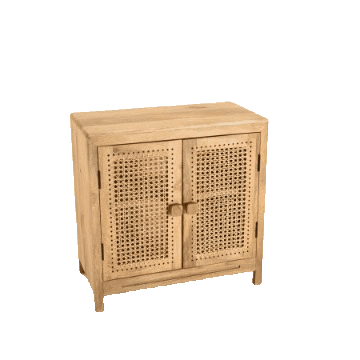 Buffet marron 2 portes bois de manguier et cannage couleur naturelle. Dimensions : 80 x 40 x 80 cm. Article en Manguier / Rotin / Contreplaqué.