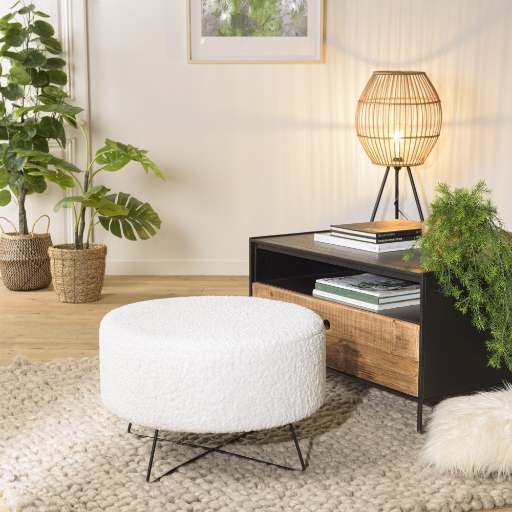 Laissez-vous séduire par ce joli pouf rond en tissu bouclette blanc et ses pieds croisés en métal noir.