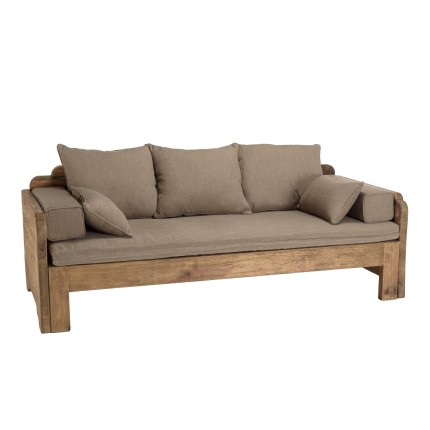 Canapé-lit bois Pin recyclé 3 places avec coussins. Dimensions : 210 x 90 x 75 cm. Article en Pin recyclé/Tissu polyester.
