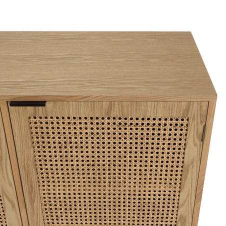Buffet 3 portes cannage naturel pieds métal noir. Dimensions : 144 x 40 x 75.5 cm. Article en MDF plaqué frêne/Métal/Rotin.