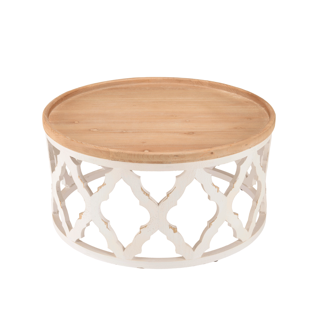 Table basse ronde 81x81cm plateau naturel piètement blanc vieilli motifs ajourés. Dimensions : 80 x 80 x 41 cm. Article en MDF plaqué sapin.