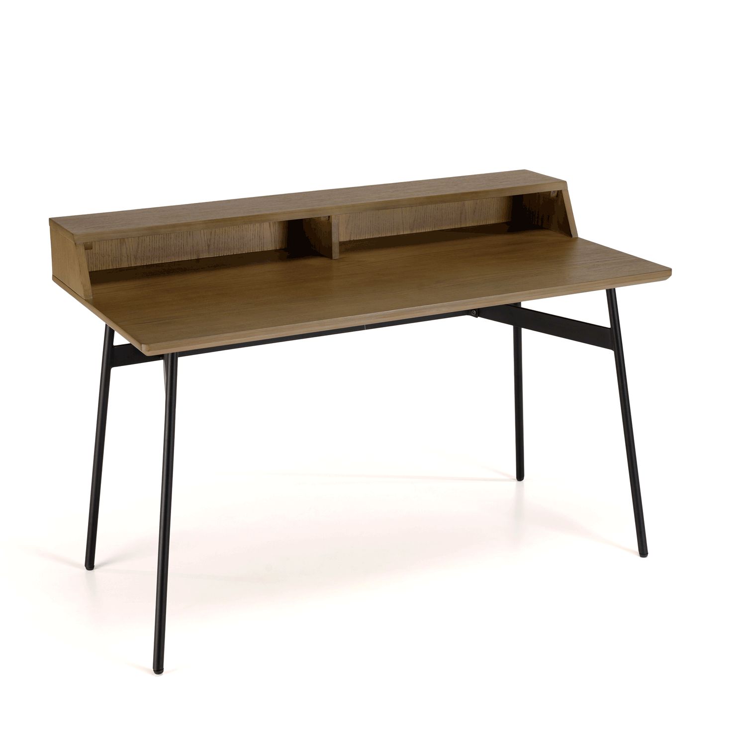 Bureau marron foncé 2 niches pieds métal noir. Dimensions : 120 x 60 x 80.5 cm. Article en MDF plaqué chêne / Acier.