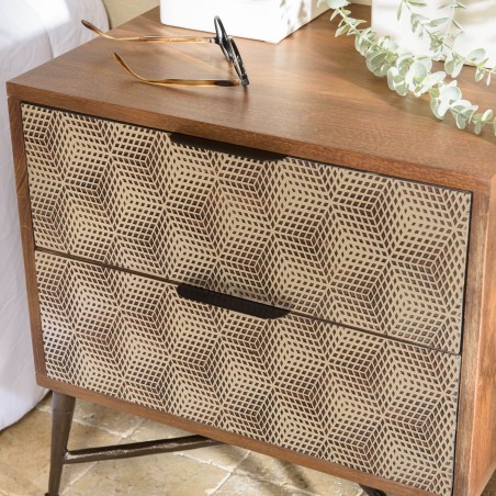 Chevet en bois de manguier 2 tiroirs motifs ethniques dorés. Dimensions : 50 x 40 x 51 cm. Article en Manguier/Acier/MDF.