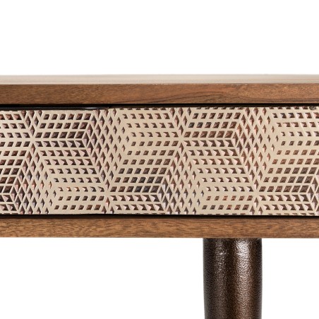 Console en bois de manguier 2 tiroirs motifs ethniques dorés. Dimensions : 110 x 40 x 76 cm. Article en Manguier/Acier/MDF.