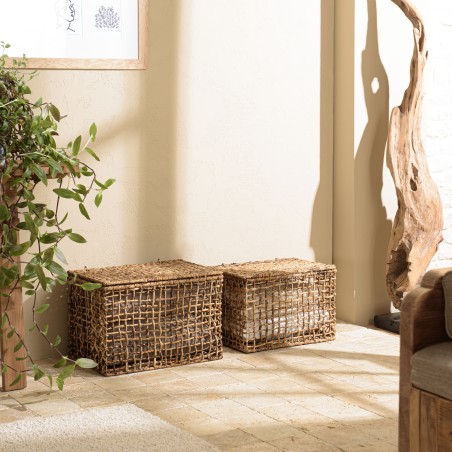 Set de 2 paniers de rangement en tissage naturel ajouré. Dimensions : 45 x 33 x 31 cm/51 x 37 x 34.5 cm. Article en Abaca (chanvre de Manille)/Acier.