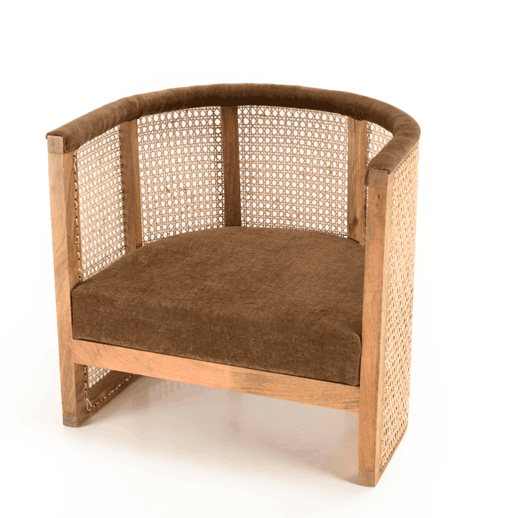 Fauteuil en manguier dossier cannage naturel assise couleur taupe. Dimensions : 75 x 60 x 70 cm. Article en Manguier/Rotin/Tissu polyester/Mousse polyuréthane.
