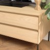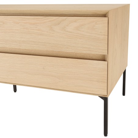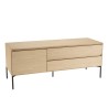 Meuble TV naturel 1 porte 2 tiroirs pieds métal noir. Dimension 130 x 45 x 52 cm. Article en MDF plaqué chêne/Chêne/MDF/Acier.