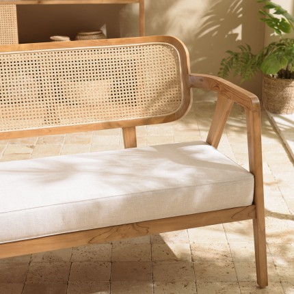 Sublimez votre espace de détente avec ce canapé 2 places en teck, son dossier en cannage naturel et son coussin gris.