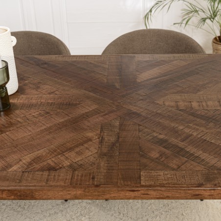 Cette table rectangulaire s'intégrera facilement dans votre salle à manger, devenant rapidement la pièce maîtresse de votre intérieur. Son plateau en bois recyclé, orné de détails en chevrons, et ses quatre pieds fins et épurés en métal noir apporteront une nouvelle touche d'élégance à votre espace de vie.