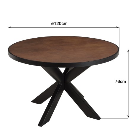 Table à manger 120x120 couleur rouille effet pierre. Dimension plateau : 120 x 120 x 76 cm. Article en MDF plaqué polyuréthane/Acier.