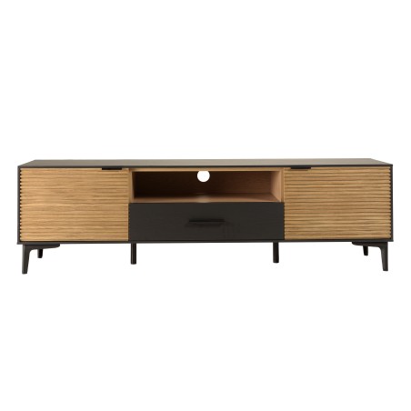 Ce meuble TV propose une ambiance chaleureuse et authentique pour votre salon. Les pieds métalliques noirs apportent une touche contemporaine. Il offre également un espace de rangement supplémentaire avec ses deux portes et son tiroir, le tout dans un style tendance.