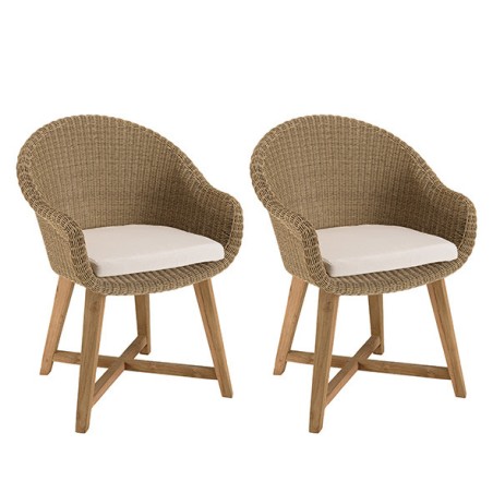 Lot de 2 fauteuils jardin rotin synthétique et coussin pieds croisés. Article rotin synthétique/teck/mousse/aluminium/tissu polyester 100%. Dimension 66 x 55 x 88 cm.
