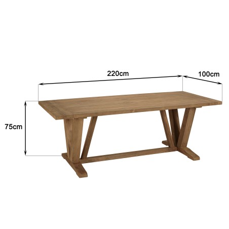 Table à manger jardin 220x100cm teck recyclé pieds en V inversé. Teck recyclé. Dimensions 220 x 100 x 75 cm