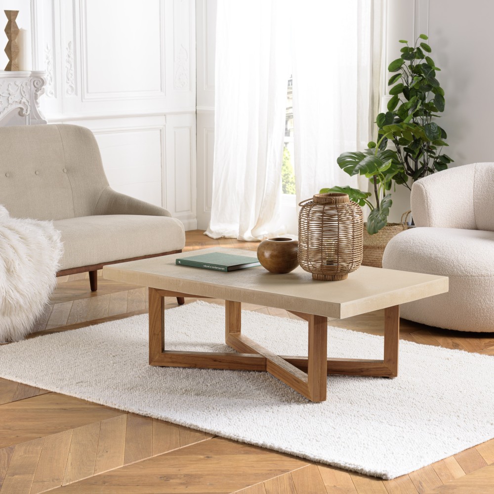 Table basse rect. 120x70cm en béton beige pieds croisés en teck. Article en Béton/Teck. Dimension 120 x 70 x 42 cm.