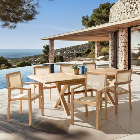 Convivialité et légèreté sont au rendez-vous avec cet ensemble de jardin. Conçu en teck et textilène, accueille 8 à 10 personnes pour des repas décontractés et des moments de partage sous le soleil. Son design moderne et sa structure robuste en font un incontournable de vos étés en extérieur.