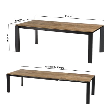 Table à manger rectangulaire extensible 220/320cm bois teck recyclé pieds métal noir. Dimensions : 220 x 100 x 76.5 cm. Article en 220 x 100 x 76.5 cm. Article en Teck recyclé/Aluminium/MDF/Acier.