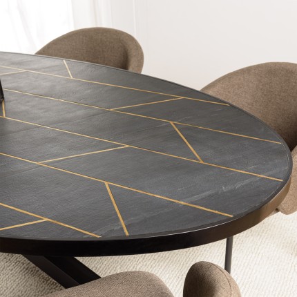 Table à manger 220x110cm effet pierre motifs dorés. Article en MDF plaqué polyuréthane/Acier/Laiton. Dimension 220 x 110 x 76 cm.