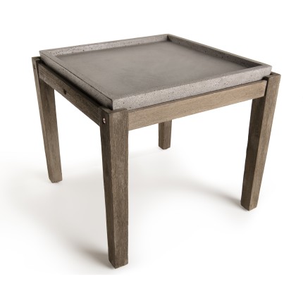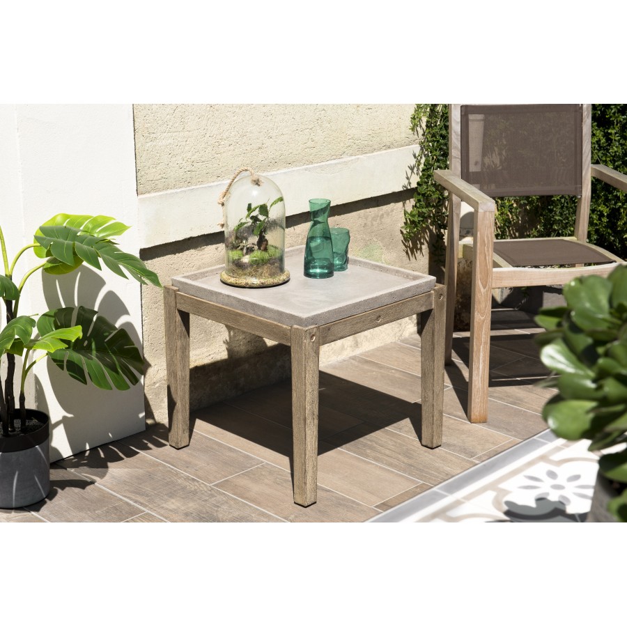Table d'appoint de jardin carrée béton et pieds en bois. Dimensions : 53.5 x 53.5 x 48.5 cm. Article en béton et acacia.